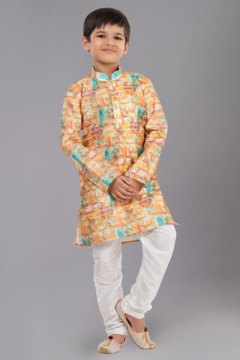 Achieve a stylish makeover this season when you dress up in this Multi colored designer kid’s kurta pajama. Buy this outfit which is made of Polyester Mono fabric and beautifully crafted with Printed and Sequin Work. Team it with brooch and mojaris to elevate your style. The kurta is accompanied by White colored pajama made of Banarasi Dupion Silk fabric. Note slight color variation may be possible due to the digital photography.