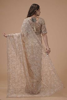 Spread the aura of freshness with this beautiful Beige colored designer saree. Order this saree which is made of Organza fabric and is beautifully crafted with Sequin Embroidery Work. Pair this saree with ethnic jewellery and a pair of heels to elevate your style. This saree comes with a matching, Organza blouse fabric. Note slight color variation may be possible due to the digital photography. The accessories shown in the image is for photography purposes.