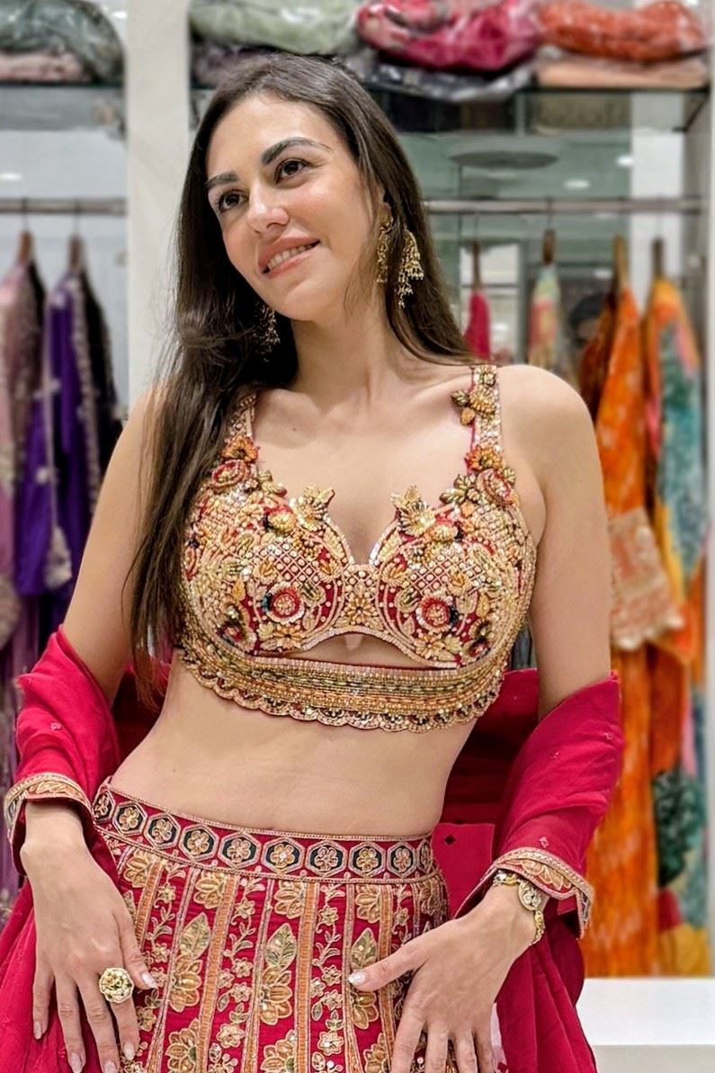 Feel comfortable without compromising on style by wearing this ravishingRani colored designer indo-western lehenga choli. Shop online for this lehenga choli crafted from Dola Silk fabric embellished with Floral Motifs, Zari, Sequin, Thread, Zarkan, and Embroidery Work. The latkan adds a charm to the lehenga composed of hand-made round-shaped tassel, with ethnic work hanging beads latkan. Complete your look with ethnic jewelry and heels. The ensemble includes a matching, embellished Chiffon fabric dupatta. Please note that color variations may occur due to digital photography, and the accessories shown are for illustrative purposes only.