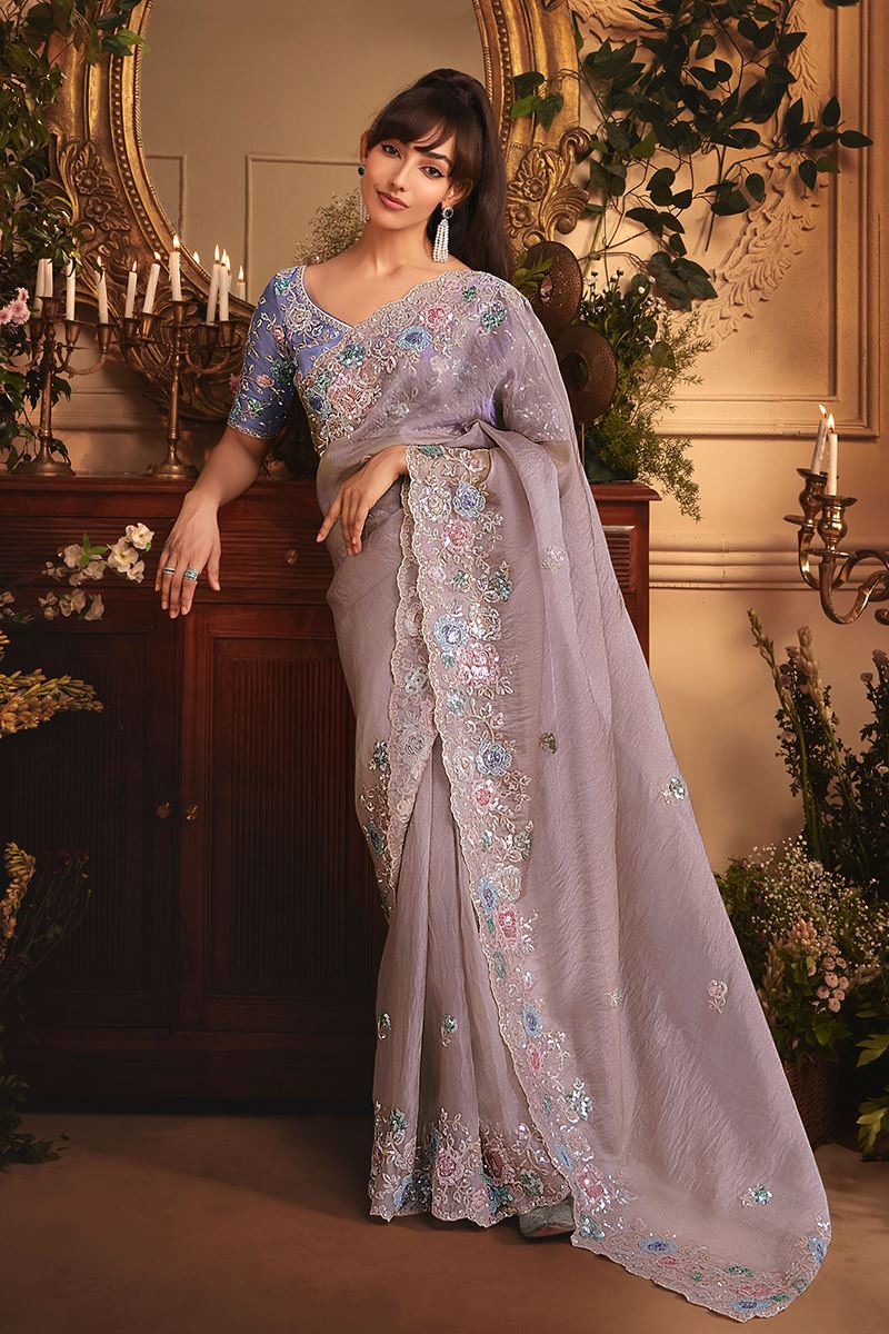 Keep ahead in style and design with this alluring Light Grey colored designer saree. Shop online for this saree which is made of Tissue Organza Silk fabric and is beautifully crafted with Heavy Zari, Resham Embroidery with Stone and Lace Border Work. Pair this saree with ethnic jewellery and a pair of heels to elevate your style. This saree comes with a Lavender colored, Pure Silk blouse fabric. Note slight color variation may be possible due to the digital photography. Accessories shown in the image is for photography purpose.