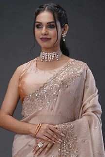 Get praised for your beauty and charm with this exotic Beige colored designer saree. Shop online for this saree which is made of Organza fabric and is beautifully crafted with Sequin Embroidery Work. Pair this saree with ethnic jewellery and a pair of heels to elevate your style. This saree comes with a matching, Silk blouse fabric. Note slight color variation may be possible due to the digital photography. The accessories shown in the image is for photography purposes.