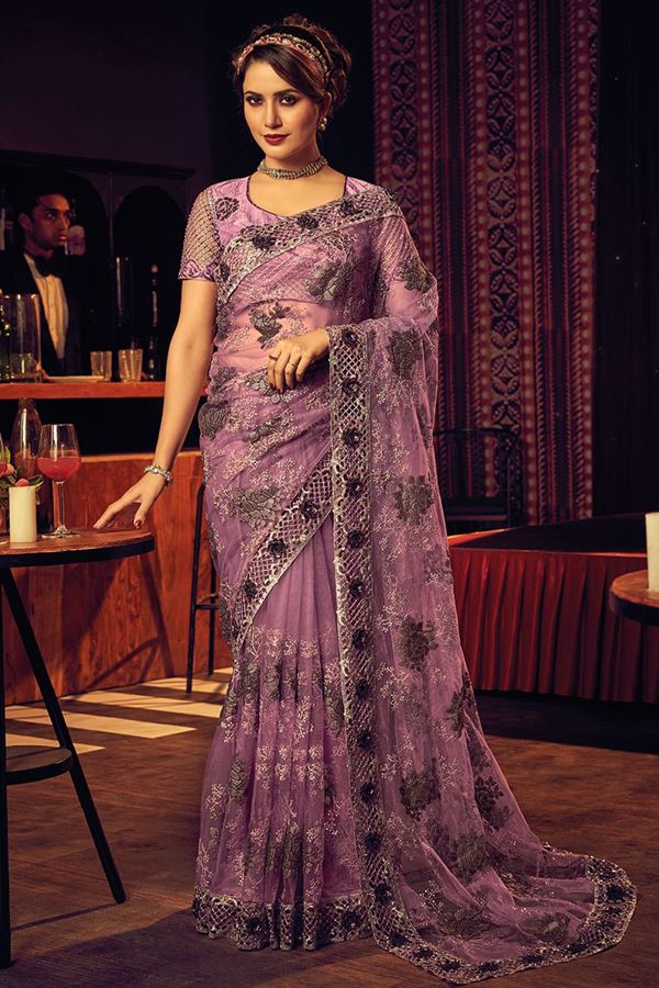 Boost your fashion style with this beautiful Pink Colored Designer Saree. This Saree is made of Net fabric and is beautifully crafted with Sequins, Velvet, Rexin Patch, Katdana and Zarkan work with Lace Border. Pair this Saree with ethnic jewellery and a pair of heels to elevate your style. This Saree comes with matching Monalisha Silk unstitched blouse fabric. The blouse in this picture is for photo purpose only. Note: Color may slightly vary due to digital photography.