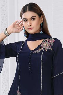 Get praised for your beauty and charm with this heavenly Navy Blue designer A-line suit. Collection of this suit crafted from Georgette fabric, which features Embroidery Work. Enhance your ensemble with ethnic jewelry and a pair of heels for a sophisticated touch. The suit comes with a matching dupatta and a bottom both made from Georgette fabric. Please be aware that slight color variations may occur due to digital photography, and the accessories shown are only for illustration.