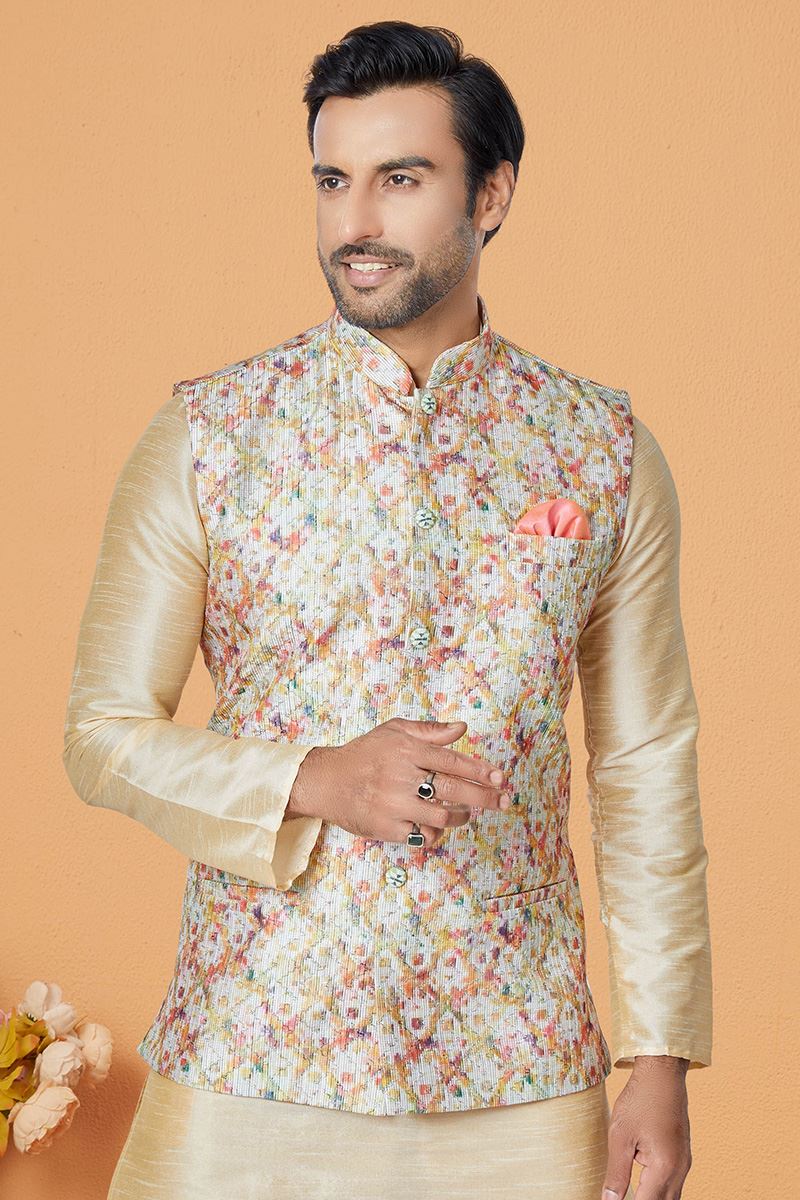 Magnificent Cream and Multi Designer Men’s Kurta Jacket Sets for Engagement, Reception, Sangeet, and Party