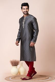 Enunciate your ethnic identity with this Grey colored designer men’s kurta pyjama. Order this outfit which is made of Mulberry fabric and beautifully crafted with Weaving Work. Team it with brooch and mojaris to elevate your style. The kurta is accompanied by Maroon colored churidar made of Banarasi Dupion fabric. Note slight color variation may be possible due to the digital photography.