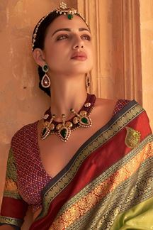 Lift up your style quotient with this divine Parrot Green Colored Designer Saree. This Saree is made of Patola Silk fabric and is beautifully crafted with Zari Weaving Print Work. Pair this Saree with ethnic jewellery and a pair of heels to elevate your style. This Saree comes with Purple colored, Patola Silk, Unstitched blouse fabric. Belt is not available. Note: Slight colour variation may be possible due to the Digital photography. Accessories shown in the image is for photography purpose.