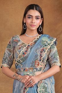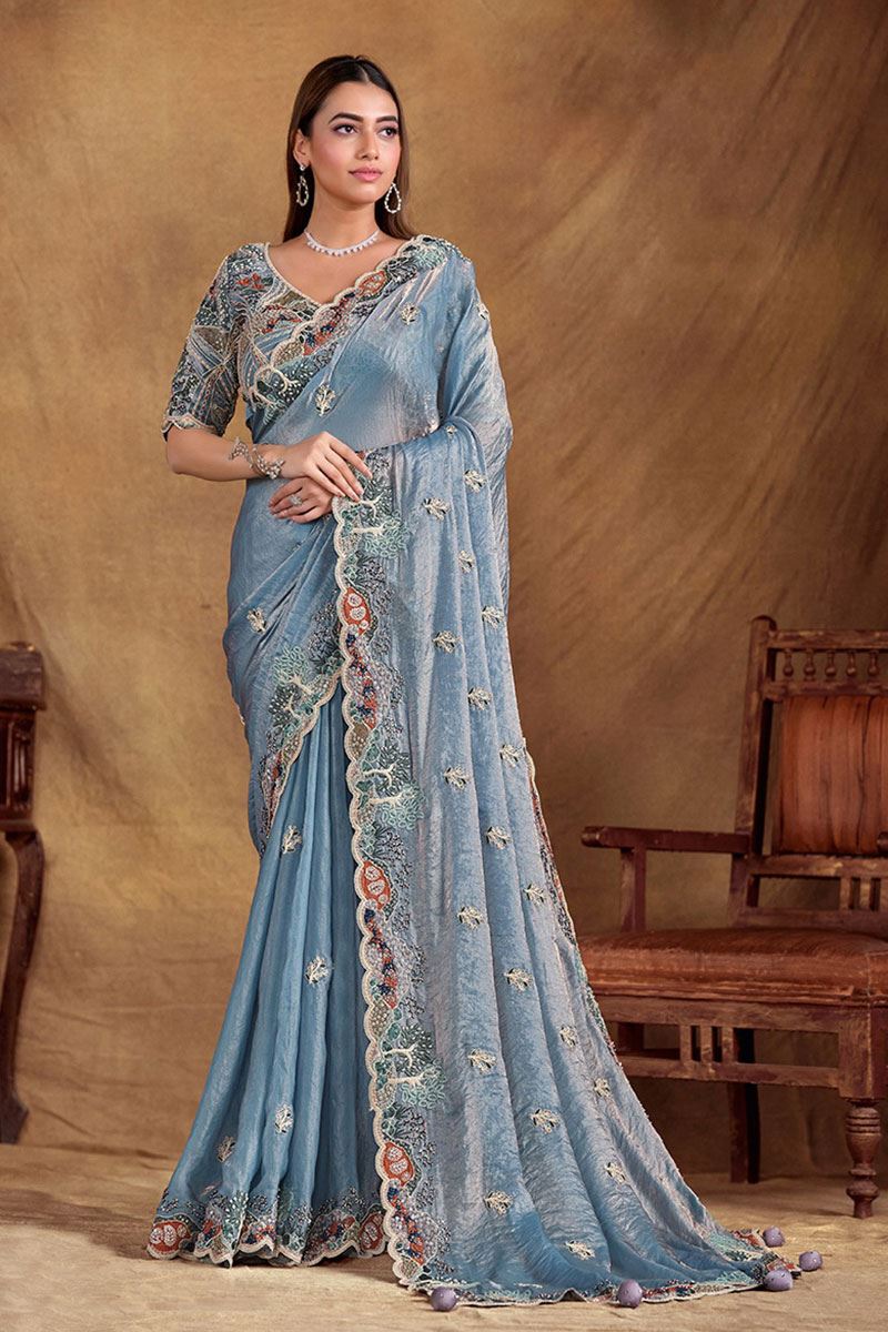 Lift up your style quotient with this divine Sky Blue colored designer saree. Shop online for this saree which is made of Two Tone Satin Silk fabric and is beautifully crafted with Sequin Embroidery, Zari, Thread, and Moti Work. Pair this saree with ethnic jewellery and a pair of heels to elevate your style. This saree comes with a matching, Japan Satin blouse fabric and a matching belt. Note slight color variation may be possible due to the digital photography. Accessories shown in the image is for photography purpose.