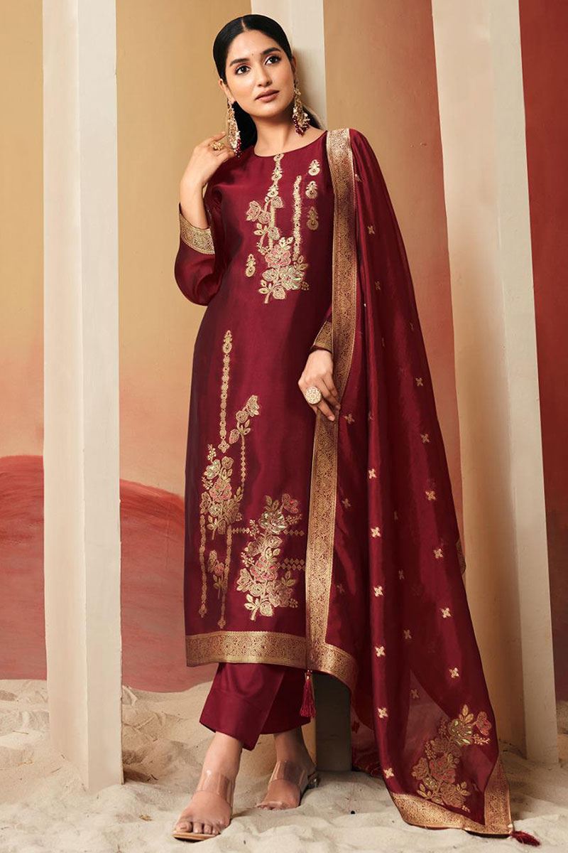 Be the starlight of any event with this attractive Maroon designer straight cut suit. Order this suit crafted from Pure Silk fabric, which features Elegant Floral Jacquard Woven Design with Crystal & Tassels on Dupatta. Enhance your ensemble with ethnic jewelry and a pair of heels for a sophisticated touch. The suit comes with a matching dupatta and a bottom. The bottom is made from Pure Satin fabric and dupatta is made from Pure Silk fabric. Please be aware that slight color variations may occur due to digital photography, and the accessories shown are only for illustration.