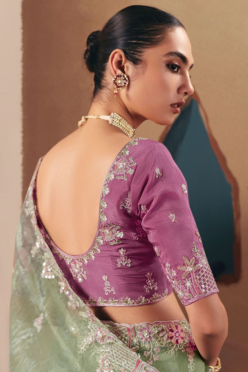 Style and trend will be at the peak of your beauty when you wear this exotic Pista Green colored designer saree. Order this saree which is made of Premium Fancy Silk fabric and is beautifully crafted with Heavy Zari, Resham, Sequin Embroidery with Stone and Crosia Lace Border Work. Pair this saree with ethnic jewellery and a pair of heels to elevate your style. This saree comes with a Pink colored, Pure Silk blouse fabric. Note slight color variation may be possible due to the digital photography. Accessories shown in the image is for photography purpose.