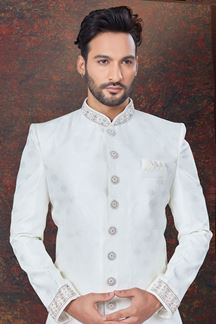 Get ready to look stylish in this Off-White designer Indo-Western Sherwani. Order this stylish attire crafted from Jacquard Silk fabric and embellished with hand work. Pair it with a brooch and semi-formal shoes to elevate your look. This outfit includes a matching trouser pant made of art dhupion fabric. Note: Color may vary slightly due to digital photography