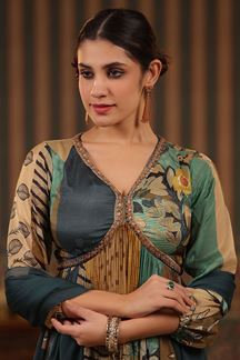 Wear the graceful Multi Colored Designer Palazzo Suit. Buy this Suit which is made of Viscose Chinon fabric and is elegantly crafted with Floral Print Work. Team it with ethnic accessories and heels to elevate your looks. This Suit is accompanied by Beige colored bottom and greyish blue colored dupatta. The bottom is made up of Taffeta fabric and dupatta is made up of Chiffon fabric. Note: Color may slightly vary due to digital photography. Accessories shown in the image is for photography purpose.