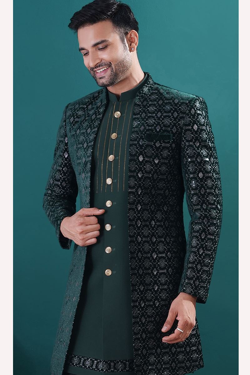 Aesthetic Bottle Green Designer Men’s Indo-Western Sets for Engagement and Reception