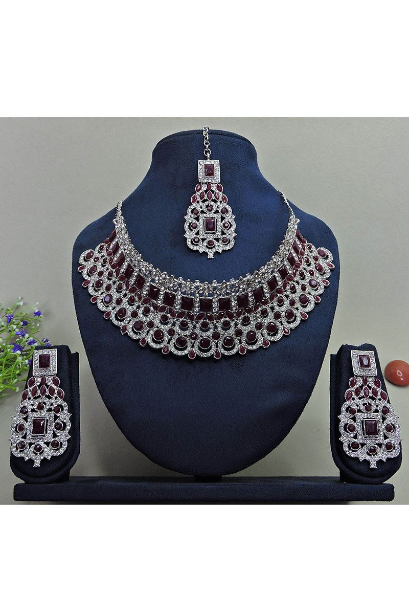 Update your clothing style as per the latest trend with this beautifulMaroon Colored Alloy Designer Necklace Set beautifully crafted with Stone and Moti Work. Order this entire set consisting of 1 Necklace, 1 Pair of Earrings, and 1 Mang Tikka. Note: Please note that Shipping charges will be applicable for accessories if it is bought along with any product under the following categories – Sarees/Lehengas/Kurtis/Gowns etc. If you are buying only accessories, then additional shipping charges will be applicable.