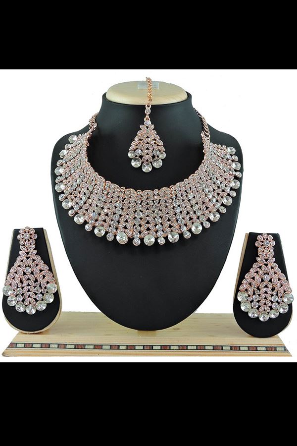 Be the starlight of any event with this beautiful Rose Gold Colored Party wear Imitation Jewellery Premium Choker with a pair of Earring. This Necklace is made of Alloy material and is crafted with Stone work. Note: Please note that Shipping charges will be applicable for accessories if it is bought along with any product under the following categories – Sarees/Lehengas/Kurtis/Gowns etc. If you are buying only accessories, then additional shipping charges will be applicable.