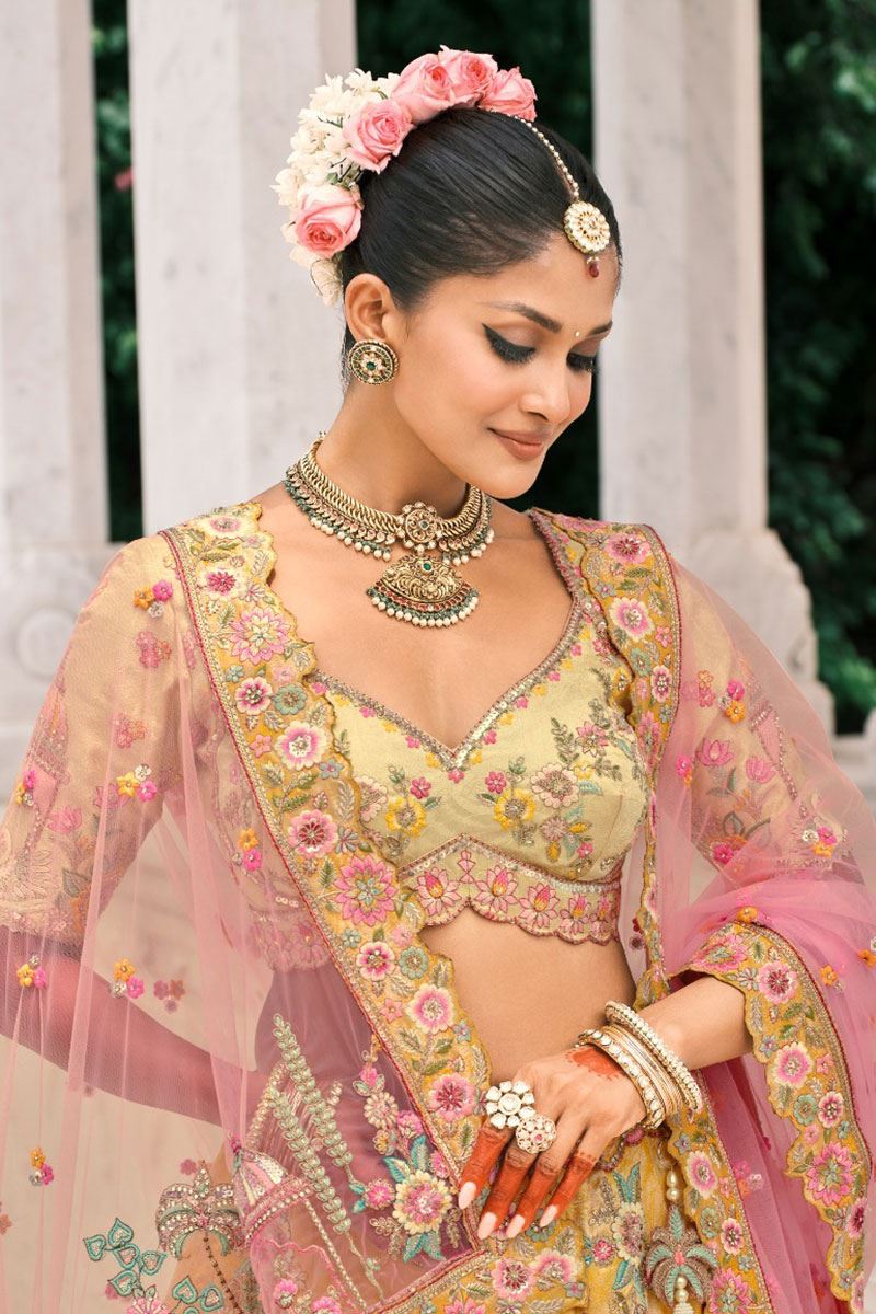 Be the starlight of any event with this beautifulYellow colored Designer Heavy Bridal Lehenga and Cream colored Choli. Collection of this lehenga choli crafted from Silk fabric embellished with Stone, Sequin, Mirror with Embroidery Work. Has a Sequin Border Work on the Hemline. The latkan adds a charm to the lehenga composed of hand-made round-shaped tassel, with ethnic work hanging beads latkan. Complete your look with ethnic jewelry and heels. The ensemble includes a Pink colored, Net fabric dupatta. Please note that color variations may occur due to digital photography, and the accessories shown are for illustrative purposes only.