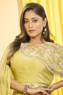 Boost your fashion style with this alluring Mustard Colored Designer Indo-Western Outfit. Collection of this unique set which is made of Georgette fabric and is elegantly crafted with Pearl, Cut-Dana, Thread, Zari, Mirror, and Heavy Embroidery Work. Team it with ethnic accessories and heels to elevate your looks. Note: Color may slightly vary due to digital photography. The accessories shown in this image are for photography purposes only.