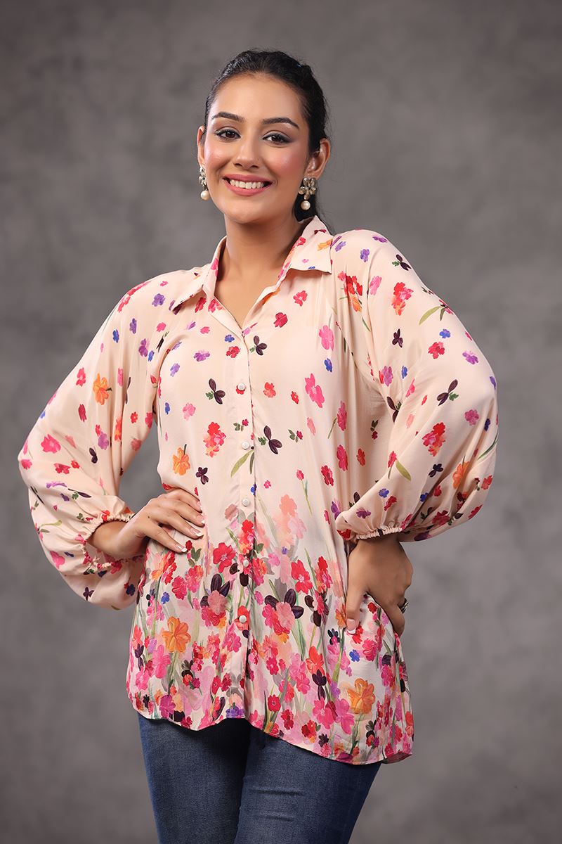 Keep ahead in style and design with this alluring Cream Colored Designer Short Top. The top is made up of Heavy Viscose Crepe fabric and is elegantly crafted with Digital Print Work. Team it with ethnic accessories and heels to elevate your looks. Note: Color may slightly vary due to digital photography.
