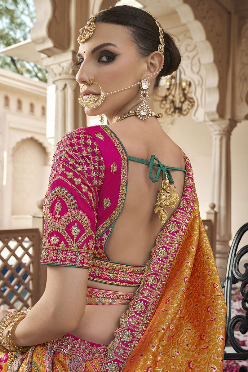 Keep ahead in style and design with this alluringMustard and Pink Designer Bridal Lehenga and Pink colored Choli. Collection of this lehenga crafted from Premium Banarasi Silk fabric and Choli crafted from Pure Silk Fabric embellished with Weaving Print with Zari, Resham Embroidery, Stone and Lace Border Work. The latkan adds a charm to the lehenga composed of hand-made round-shaped tassel, with ethnic work hanging beads latkan. Complete your look with ethnic jewelry and heels. The ensemble includes a Mustard colored, Banarasi Silk fabric dupatta and embellished matching Belt. Please note that color variations may occur due to digital photography, and the accessories shown are for illustrative purposes only.