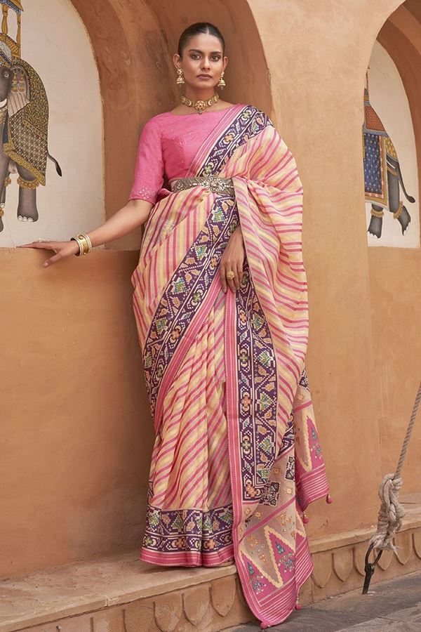Keep ahead in style and design with this alluring Cream and Pink Colored Designer Saree. Shop online for this Saree made up of Pure Brasso fabric and beautifully crafted with Printed with Stone Work. Pair this Saree with ethnic jewellery and a pair of heels to elevate your style. This Saree comes with pink colored, Smooth Silk blouse fabric. Note: Slight color variation may be possible due to the Digital photography. The belt & accessories shown in the image are for photography purposes.