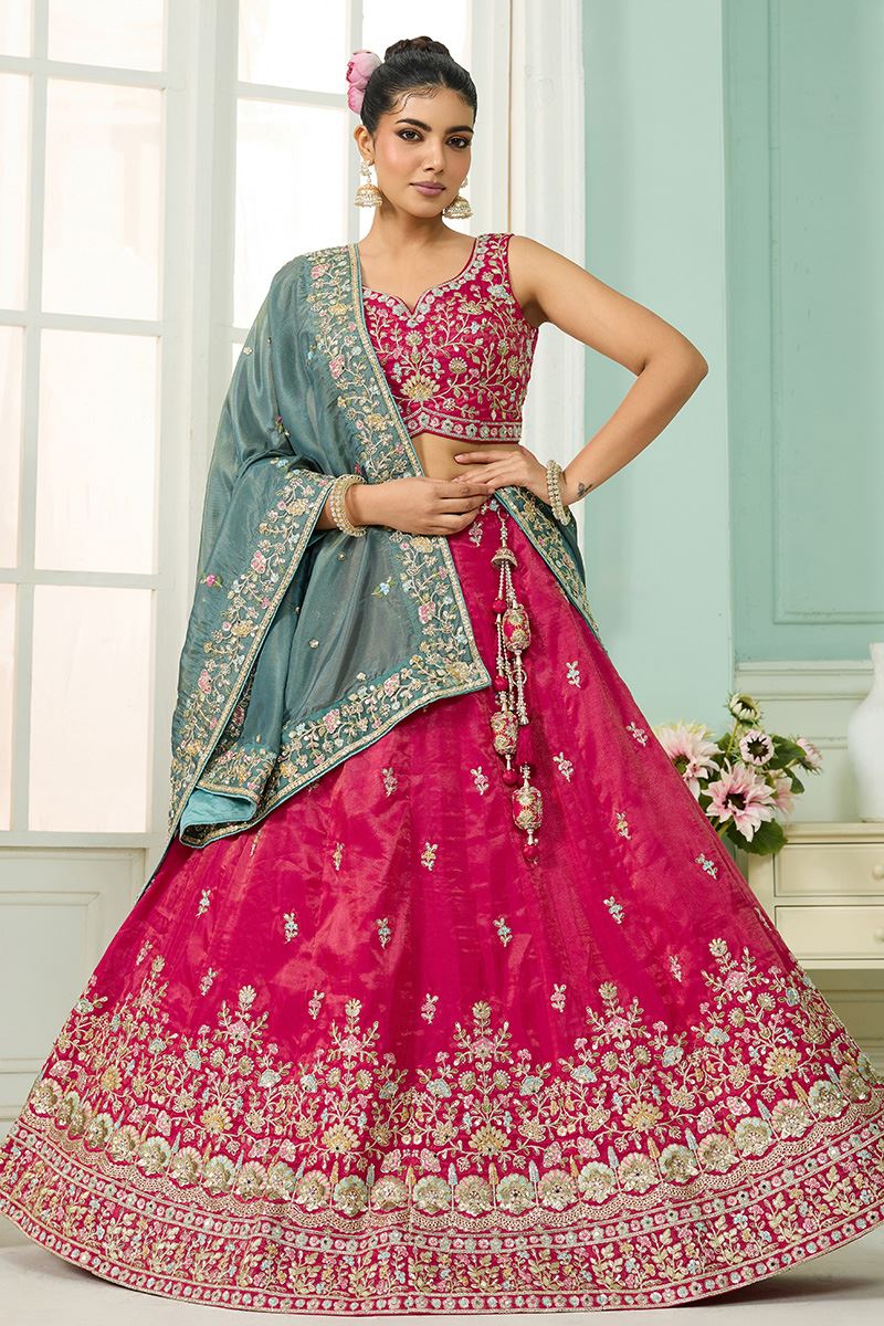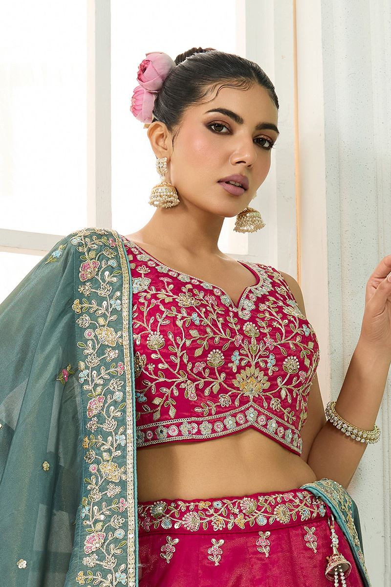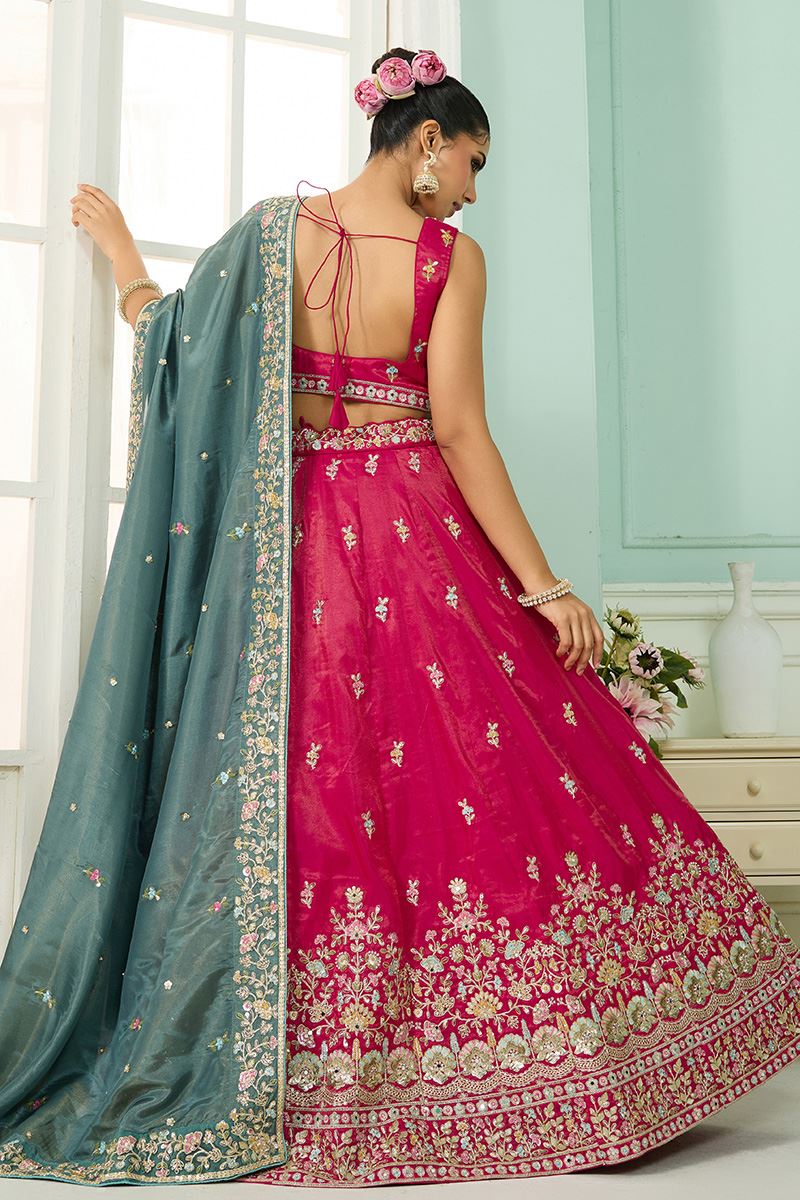 Style and trend will be at the peak of your beauty when you wear this exoticPink colored Designer Indo-Western Lehenga Choli. Buy this lehenga choli crafted from Cosmos Silk fabric embellished with Beads, Stone, and Coding Work. Has a Thread Embroidery Work. Has a Thread Cut Work Border on the Hemline. The lehenga has a double shantoon inner with 2 layers of can can 12 and 18 inches with Buckram 4 and 12 inches. The latkan adds a charm to the lehenga composed of hand-made round-shaped tassel, with ethnic work hanging beads latkan. The flare of the lehenga is 3.5 meters and the length is 42 inches. The waist and the bust of the lehenga and choli are customizable up to 40 and 42 inches. Complete your look with ethnic jewelry and heels. The ensemble includes a Teal colored, Cosmos Silk fabric dupatta embellished with sequin ethnic motif with an embroidery border work. The length of the dupatta is 2.5 meters and the width is 1 meter. Please note that color variations may occur due to digital photography, and the accessories shown are for illustrative purposes only.