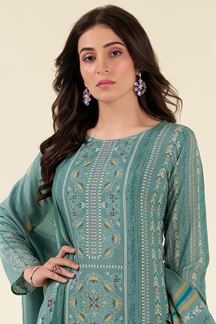 Be the starlight of any event with this beautiful Turquoise designer straight cut suit. Shop online for this suit crafted from Muslin fabric which features All Over Contrast Traditional Digital Print with Contrast Floral Resham Thread and Sequin Work. Enhance your ensemble with ethnic jewelry and a pair of heels for a sophisticated touch. The suit comes with a matching dupatta and a bottom. The dupatta is made from Muslin fabric and bottom is made from Silk Blend fabric. Please be aware that slight color variations may occur due to digital photography, and the accessories shown are only for illustration.