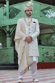 Level up your ethnicity with this Peach Colored Designer Sherwani. The Kurta of this Sherwani is made from Jacquard fabric and is adorned with Embroidery and Zari work. Team it with brooch and mojaris to elevate your style. This Kurta is accompanied with White colored pyjama. These pyjamas are made of Silk fabric. Note: Color may slightly vary due to digital photography.