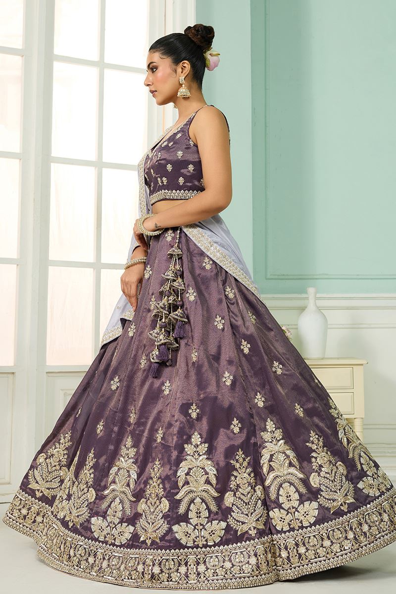 Bewitch anyone at any event with this beautifulPurple colored Designer Indo-Western Lehenga Choli. Shop online for this lehenga choli crafted from Tissue fabric embellished with Moti, Sequin, and Coding Work. Has a Thread Embroidery Work. Has a Thread Cut Work Border on the Hemline. The lehenga has a double shantoon inner with 2 layers of can can 17 and 10 inches with Buckram 12 inches. The latkan adds a charm to the lehenga composed of hand-made round-shaped tassel, with ethnic work hanging beads latkan. The flare of the lehenga is 3.5 meters and the length is 42 inches. The waist and the bust of the lehenga and choli are customizable up to 40 and 42 inches. Complete your look with ethnic jewelry and heels. The ensemble includes a Lavender colored, Tissue fabric dupatta embellished with sequin ethnic motif with an embroidery border work. The length of the dupatta is 2.5 meters and the width is 1 meter. Please note that color variations may occur due to digital photography, and the accessories shown are for illustrative purposes only.