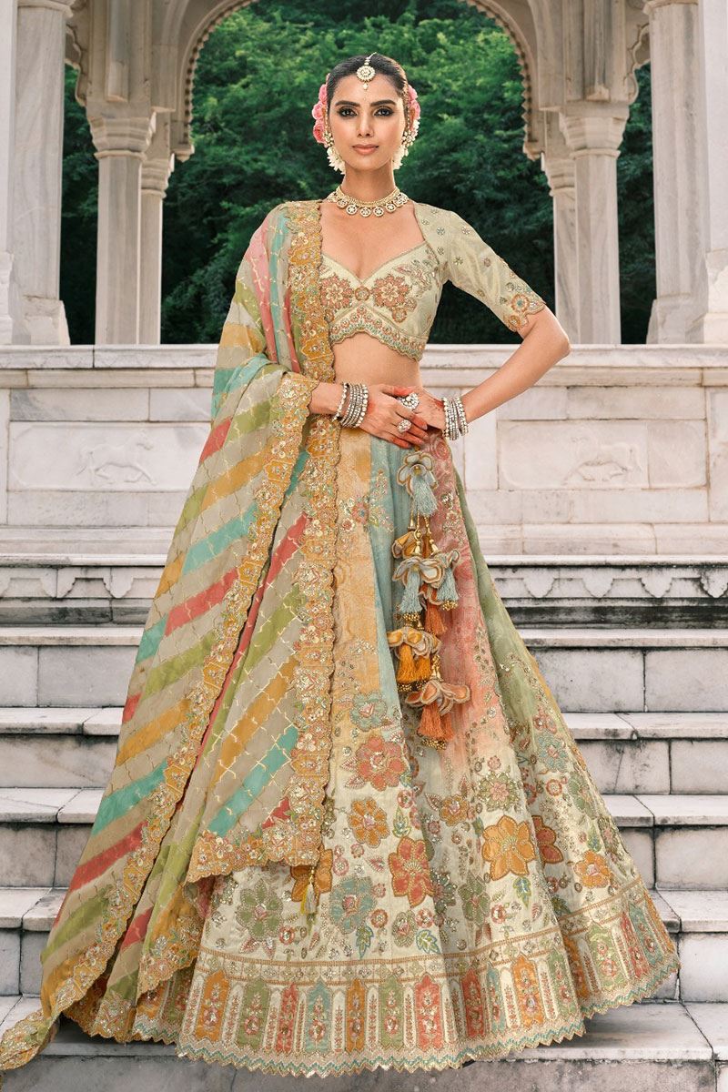Get praised for your beauty and charm with this exotic Multi colored Designer Heavy Bridal Lehenga and Off-White colored Choli. Shop online for this lehenga choli crafted from Silk fabric embellished with Stone, Sequin, Mirror with Embroidery Work. Has a Sequin Border Work on the Hemline. The latkan adds a charm to the lehenga composed of hand-made round-shaped tassel, with ethnic work hanging beads latkan. Complete your look with ethnic jewelry and heels. The ensemble includes a Multi colored, Net fabric dupatta. Please note that color variations may occur due to digital photography, and the accessories shown are for illustrative purposes only.