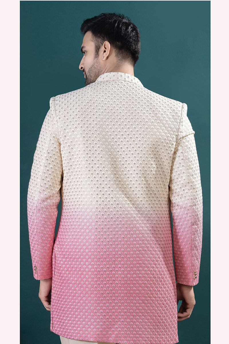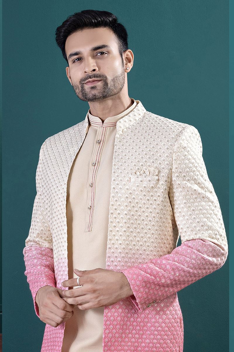 Attend traditional functions or festive occasions in style by wearing this Gold colored designer indo-western sets for men. Shop online for this elegant ensemble featuring a Gold colored kurta paired with a Shaded Gold and Pink colored, mandarin collar Jacket beautifully crafted with Imported and Lucknowie fabric. The jacket showcases intricate Thread, Sequin, and Embroidery Work for a rich, traditional look. Complete the outfit with a brooch and mojaris for added charm. This set includes Gold colored, trouser pant made from Imported fabric. Note slight color variation may be possible due to the digital photography.