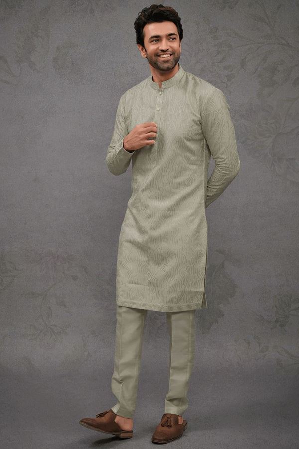 Get ready for traditional events with thisLight Mehendicolored designer kurta pant set. Collection of this set made of Silk fabric and beautifully crafted with Machine Embroidery and Resham Work. Team it with brooch and mojaris to elevate your style. This chinese collar kurta is accompanied by matching pant made of silk fabric. Note slight color variation may be possible due to the digital photography.