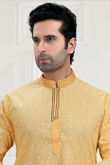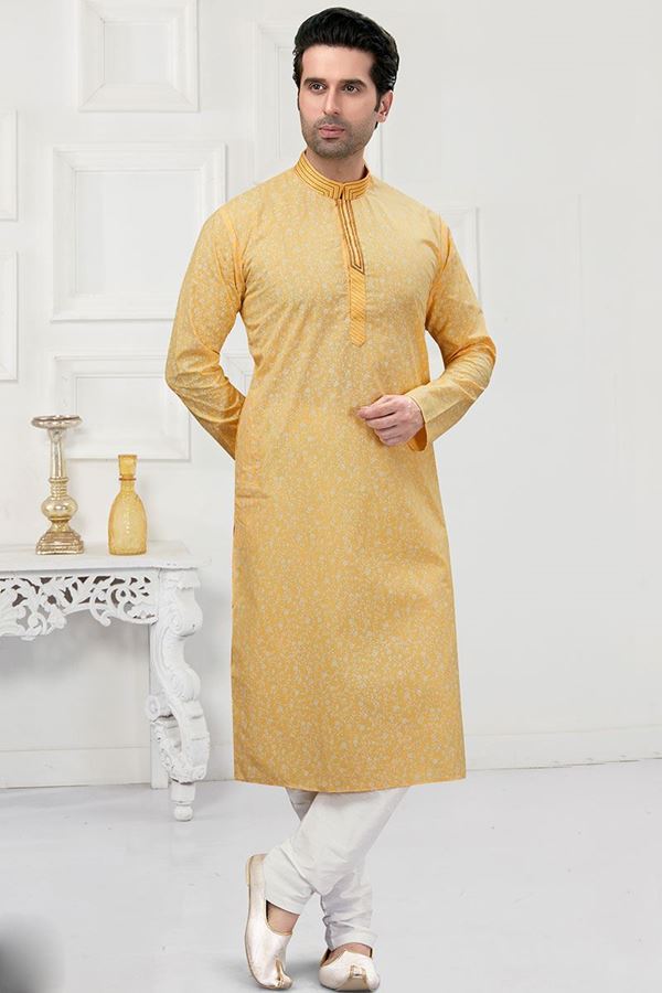 Get ready for traditional events with this Yellow Colored Designer Kurta Payjama Set. This Kurta is made from Cotton fabric and is adorned with Printed work. Team it with brooch and mojaris to elevate your style. This Kurta is accompanied with Off-White colored Churidar which is made up of Art Silk fabric. Note: Color may slightly vary due to digital photography.