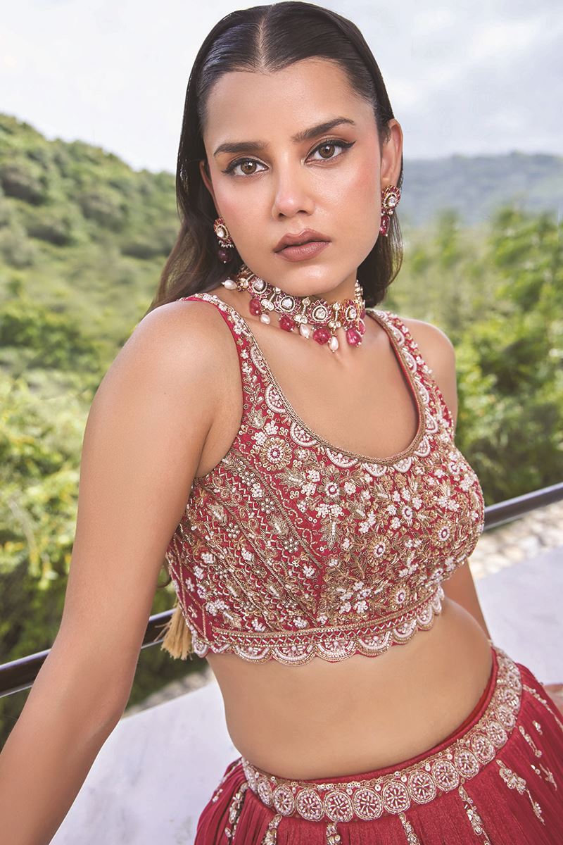 Spread the aura of freshness with this beautifulPink Designer Indo-Western Lehenga Choli. Shop online for this lehenga choli crafted from Tissue fabric embellished with Embroidery, Cut-Dana, Sequin, Zari, Floral Motifs, and Beads Work. The latkan adds a charm to the lehenga composed of hand-made round-shaped tassel, with ethnic work hanging beads latkan. Complete your look with ethnic jewelry and heels. The ensemble includes a matching, Tissue fabric dupatta. Please note that color variations may occur due to digital photography, and the accessories shown are for illustrative purposes only.