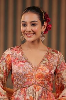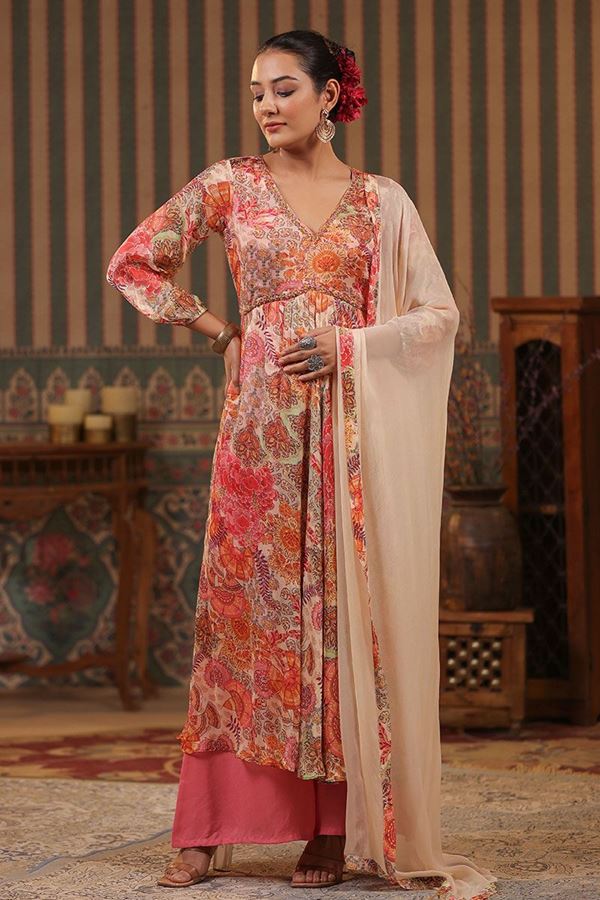 Be the starlight of any event with this attractive Multi Colored Designer Palazzo Suit. Buy this Suit which is made of Viscose Chinon fabric and is elegantly crafted with Traditional Print Work. Team it with ethnic accessories and heels to elevate your looks. This Suit is accompanied by peach colored bottom and cream colored dupatta. The bottom is made up of Taffeta fabric and dupatta is made up of Chiffon fabric. Note: Color may slightly vary due to digital photography. Accessories shown in the image is for photography purpose.