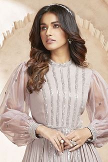 Be the starlight of any event with this attractive Lilac colored Gown. This Gown is made of Pure Georgette fabric. It is uniquely crafted with Sequins and Katdana Work. This Gown is accompanied with matching sleeves. The sleeves for the Gown are made of Organza fabric. Team it with ethnic accessories to lift up your looks.  Note: Color may slightly vary due to digital photography.
