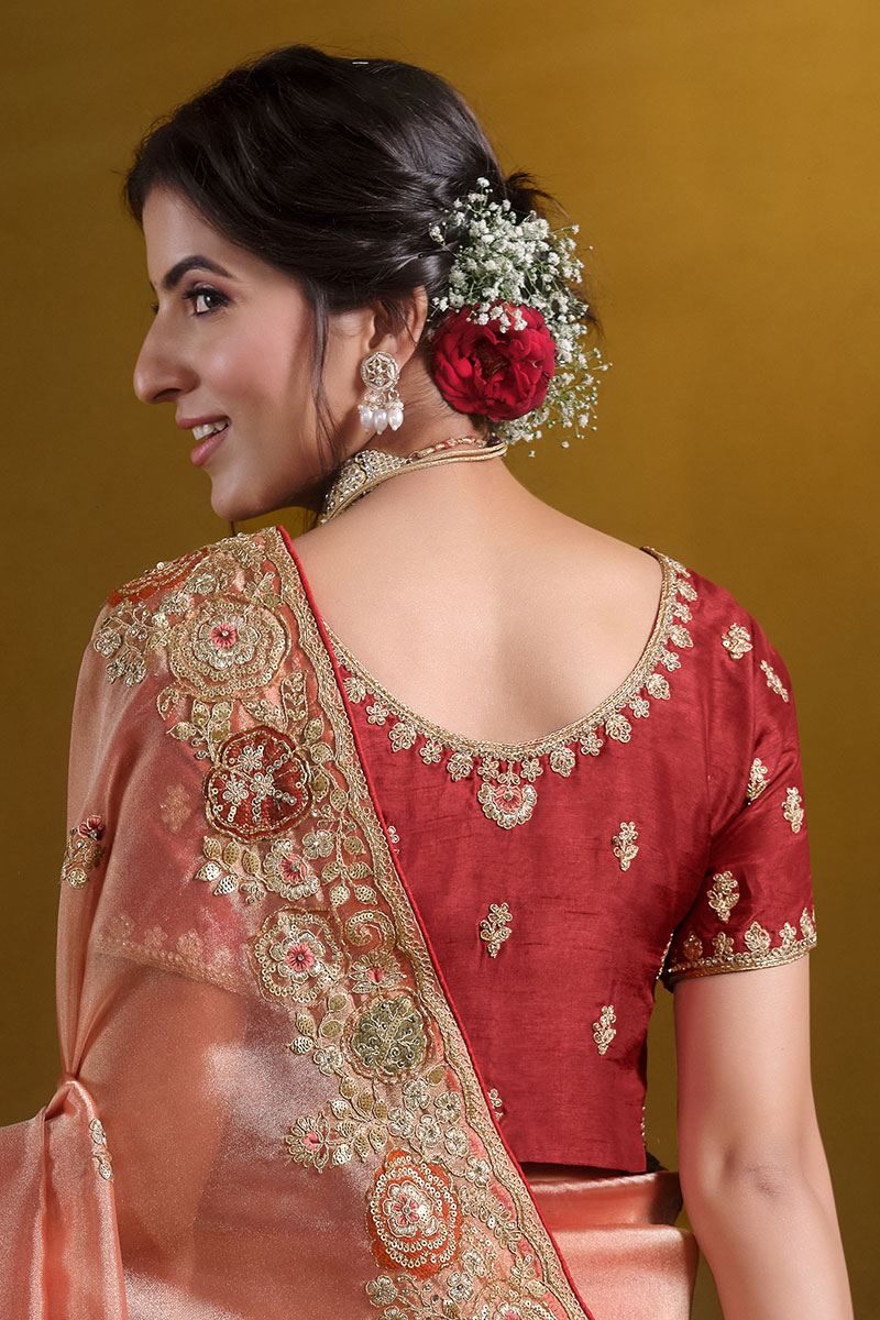 Be the starlight of any event with this attractive Orange colored designer saree. Shop online for this saree which is made of Pure Twill Tissue fabric and is beautifully crafted with Pure Khatli with Sequin Work. Pair this saree with ethnic jewellery and a pair of heels to elevate your style. This saree comes with a rust colored, Viscose Silk Satin blouse fabric. Note slight color variation may be possible due to the digital photography. Accessories shown in the image is for photography purpose.