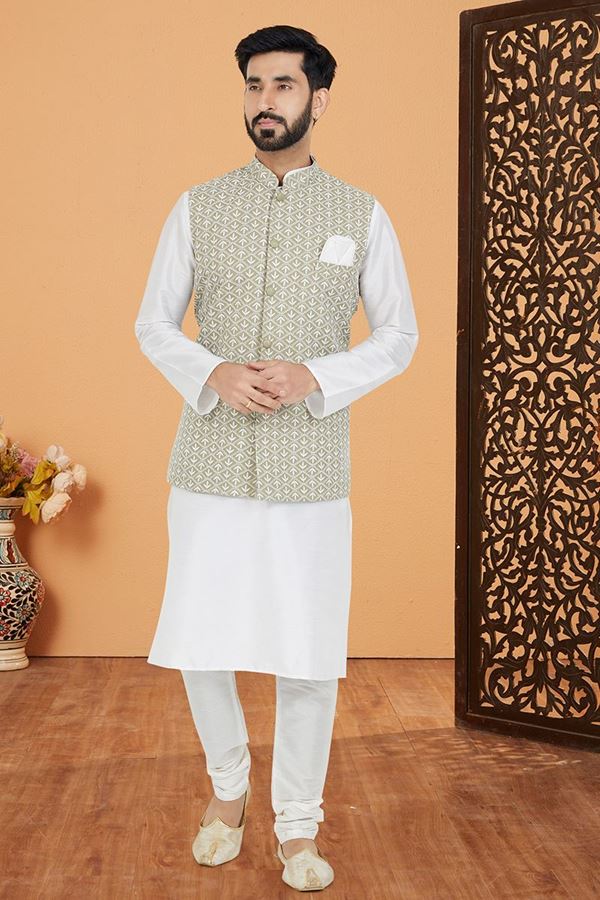 Delightful White and Light Mehendi Designer Men’s Kurta Jacket Sets for Engagement, Festivals, Reception, Sangeet, and Party