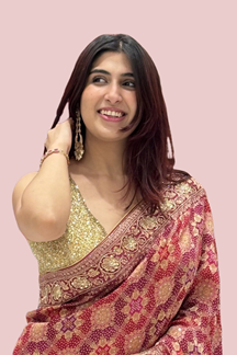 Add more glamour to your style with this beautiful Red and Pink colored designer saree. Shop online for this saree which is made of Banarasi Silk fabric and is beautifully crafted with Woven, Zari, Embroidery and Lace Border Work. Pair this saree with ethnic jewellery and a pair of heels to elevate your style. This saree comes with a golden colored, Silk blouse fabric. Note slight color variation may be possible due to the digital photography. Accessories shown in the image is for photography purpose.