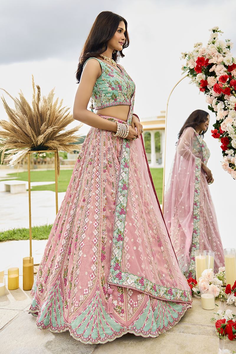 Add more glamour to your style with this beautifulPink colored Designer Indo-Western Lehenga and Sea Green colored Choli. Order this lehenga choli crafted from Tissue fabric embellished with Sequin and Stone and Coding Work. Has a Thread Embroidery Work. Has a Thread Cut Work Border on the Hemline. The lehenga has a double shantoon inner with 2 layers of can can 12 and 18 inches with Buckram 4 and 12 inches. The latkan adds a charm to the lehenga composed of hand-made round-shaped tassel, with ethnic work hanging beads latkan. The flare of the lehenga is 3.5 meters and the length is 42 inches. The waist and the bust of the lehenga and choli are customizable up to 40 and 42 inches. Complete your look with ethnic jewelry and heels. The ensemble includes a Pink colored, Net fabric dupatta embellished with sequin ethnic motif with an embroidery border work. The length of the dupatta is 2.5 meters and the width is 1 meter. Please note that color variations may occur due to digital photography, and the accessories shown are for illustrative purposes only.