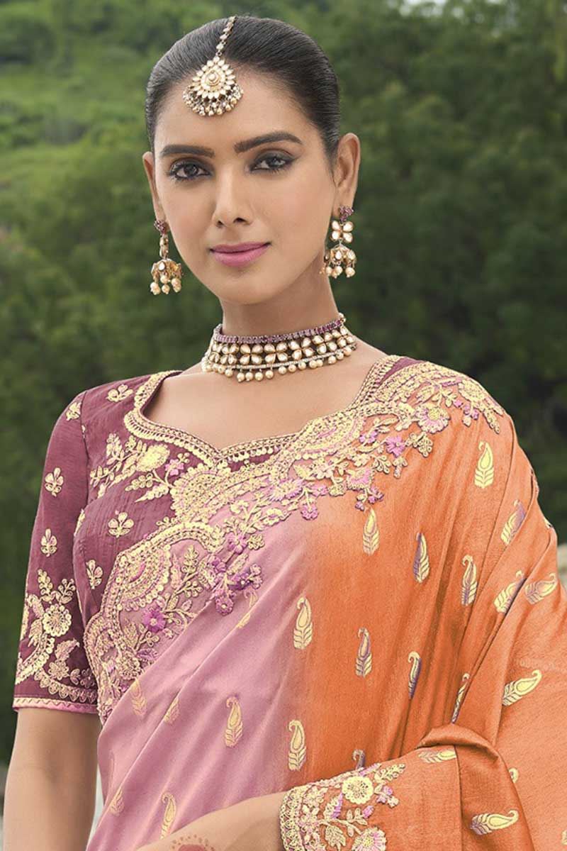 Boost your fashion style with this beautiful alluring Pink and Orange colored designer saree. Order this saree which is made of Viscose Tissue Silk fabric and is beautifully crafted with Heavy Zari, Resham, Sequin Embroidery Work with Cut Work and Lace Border Work. Pair this saree with ethnic jewellery and a pair of heels to elevate your style. This saree comes with a Purple colored, Raw Silk blouse fabric. Note slight color variation may be possible due to the digital photography. Accessories shown in the image is for photography purpose.