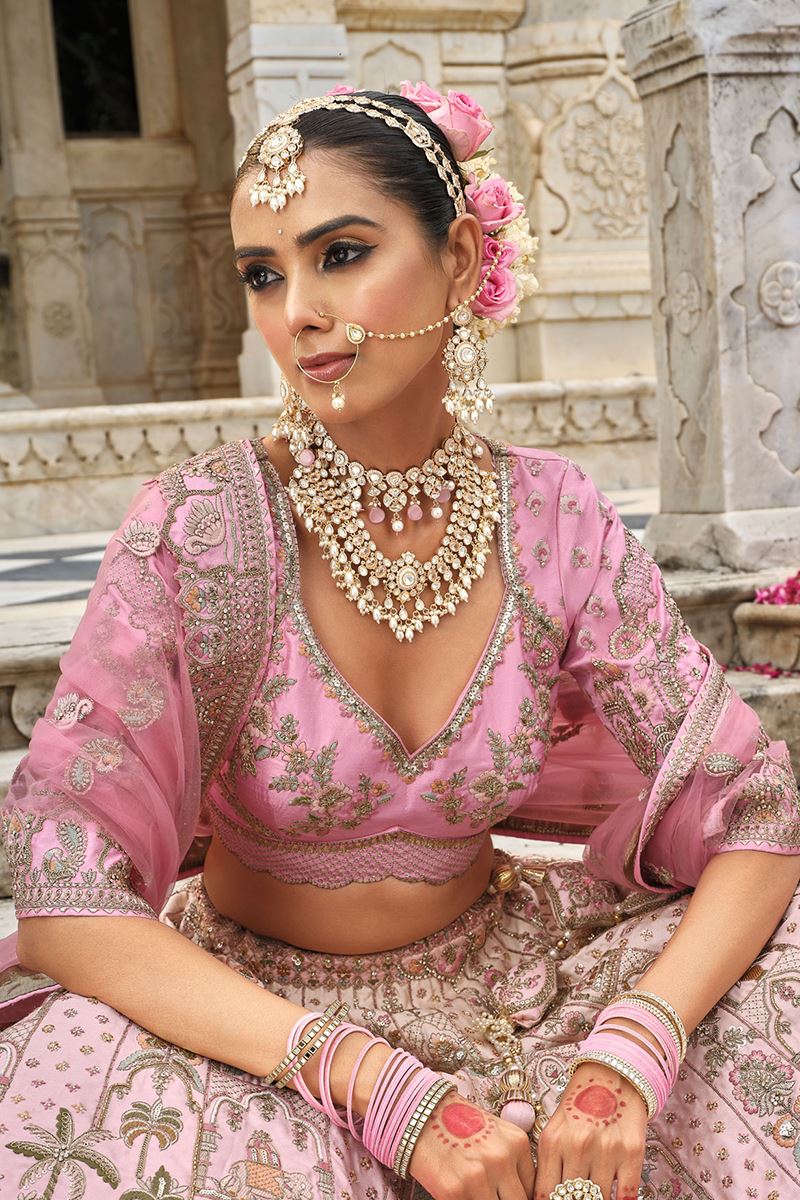Lift your style quotient with this divinePeach colored Designer Bridal Lehenga Choli. Shop online for this lehenga choli crafted from Heavy Pure Silk fabric embellished with Heavy Zari, Resham Embroidery, Khatli with Stone and Lace Border Work. The latkan adds a charm to the lehenga composed of hand-made round-shaped tassel, with ethnic work hanging beads latkan. Complete your look with ethnic jewelry and heels. The ensemble includes a matching pair of Dupattas made from Premium Net fabric. Please note that color variations may occur due to digital photography, and the accessories shown are for illustrative purposes only.