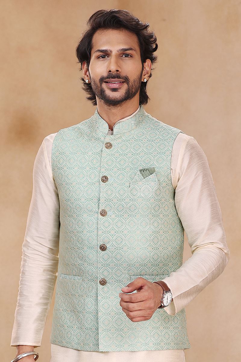 Achieve a stylish look in this Cream Colored Designer Kurta, Pyjama with Jacket Set. This Kurta is made from Art Banarasi Silk fabric. Team it with brooch and mojaris to elevate your style. This Kurta is accompanied with matching Pyjamas and Pista Green Colored Jacket. These Pyjamas are made of Art Banarasi Silk Fabric and Jacket are made of Jacquard Banarasi Silk Fabric. The Jacket is adorned with Machine Embroidery and Sequins work. Note: Color may slightly vary due to digital photography.