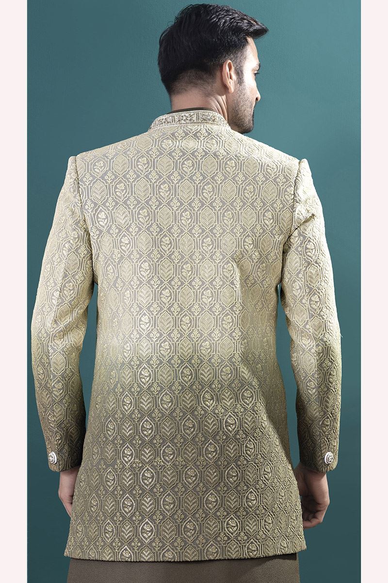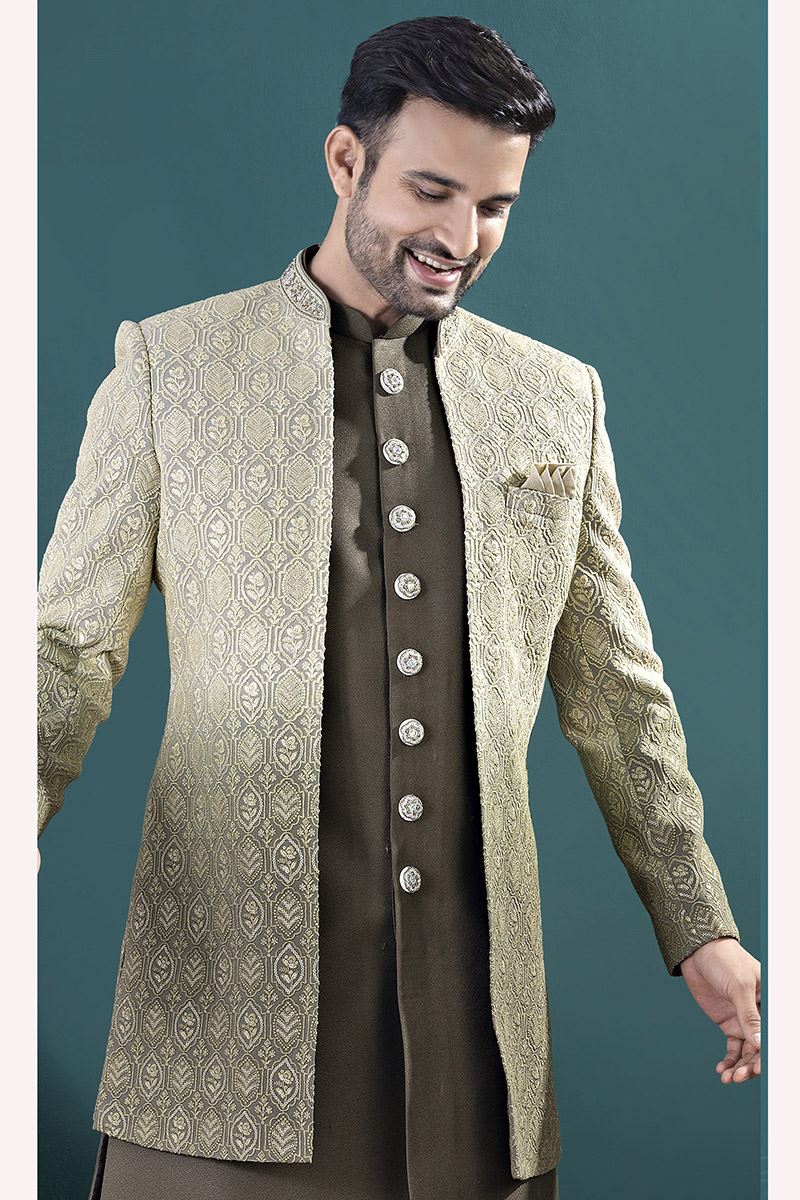 Fashionable Mehendi Green Designer Men’s Indo-Western Sets for Engagement and Reception