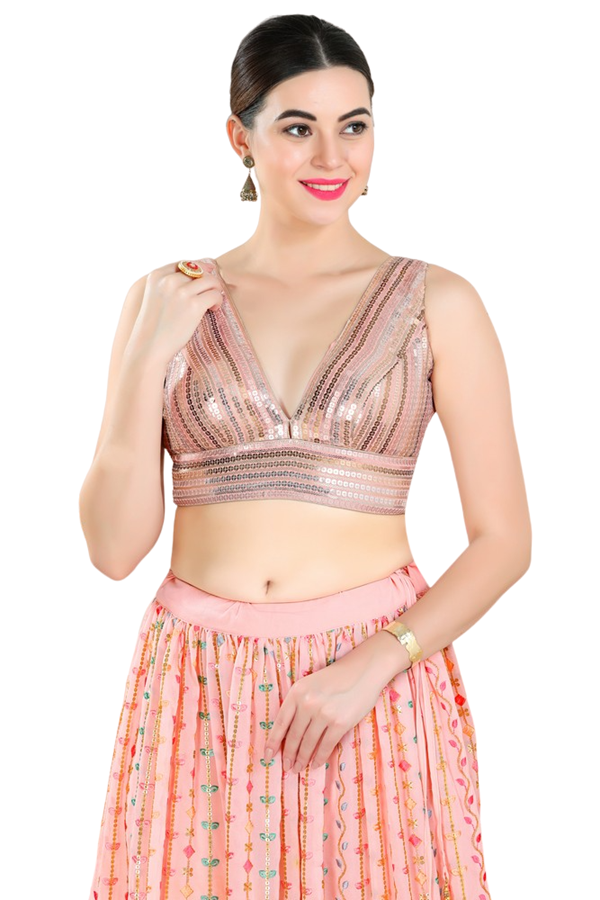 Add more glamour to your style with this alluring Peach Colored Designer V-Neck Blouse. This Blouse is made of Net fabric and is beautifully crafted with Sequin Work. Pair this Blouse with ethnic jewellery and a contrast shade saree or a skirt. Slight colour variation may be possible due to the Digital photography.