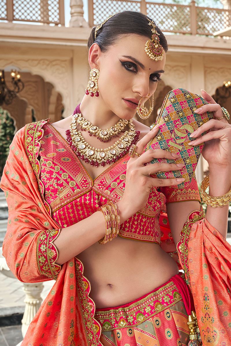 Boost your fashion style with this beautifulPink and Peach Designer Bridal Lehenga and Pink colored Choli. Shop online for this lehenga crafted from Premium Banarasi Silk fabric and Choli crafted from Pure Silk Fabric embellished with Weaving Print with Zari, Resham Embroidery, Stone and Lace Border Work. The latkan adds a charm to the lehenga composed of hand-made round-shaped tassel, with ethnic work hanging beads latkan. Complete your look with ethnic jewelry and heels. The ensemble includes a Peach colored, Banarasi Silk fabric dupatta and embellished matching Belt. Please note that color variations may occur due to digital photography, and the accessories shown are for illustrative purposes only.