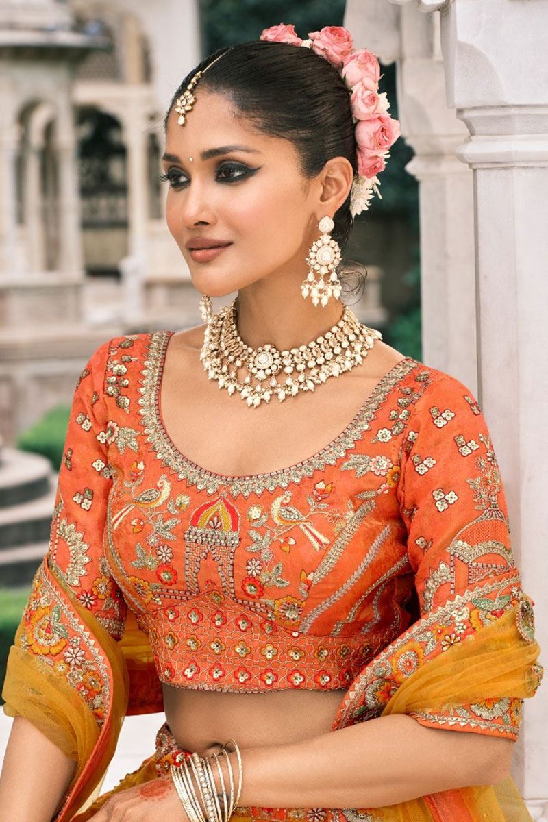 Get praised for your beauty and charm with this heavenlyMulti colored Designer Heavy Bridal Lehenga and Orange colored Choli. Shop online for this lehenga choli crafted from Silk fabric embellished with Stone, Sequin, Mirror with Embroidery Work. Has a Sequin Border Work on the Hemline. The latkan adds a charm to the lehenga composed of hand-made round-shaped tassel, with ethnic work hanging beads latkan. Complete your look with ethnic jewelry and heels. The ensemble includes a Yellow colored, Net fabric dupatta. Please note that color variations may occur due to digital photography, and the accessories shown are for illustrative purposes only.