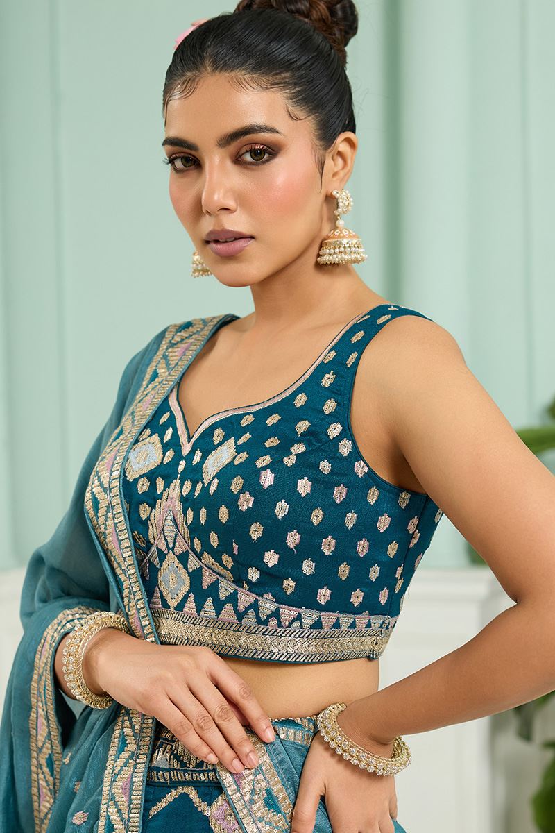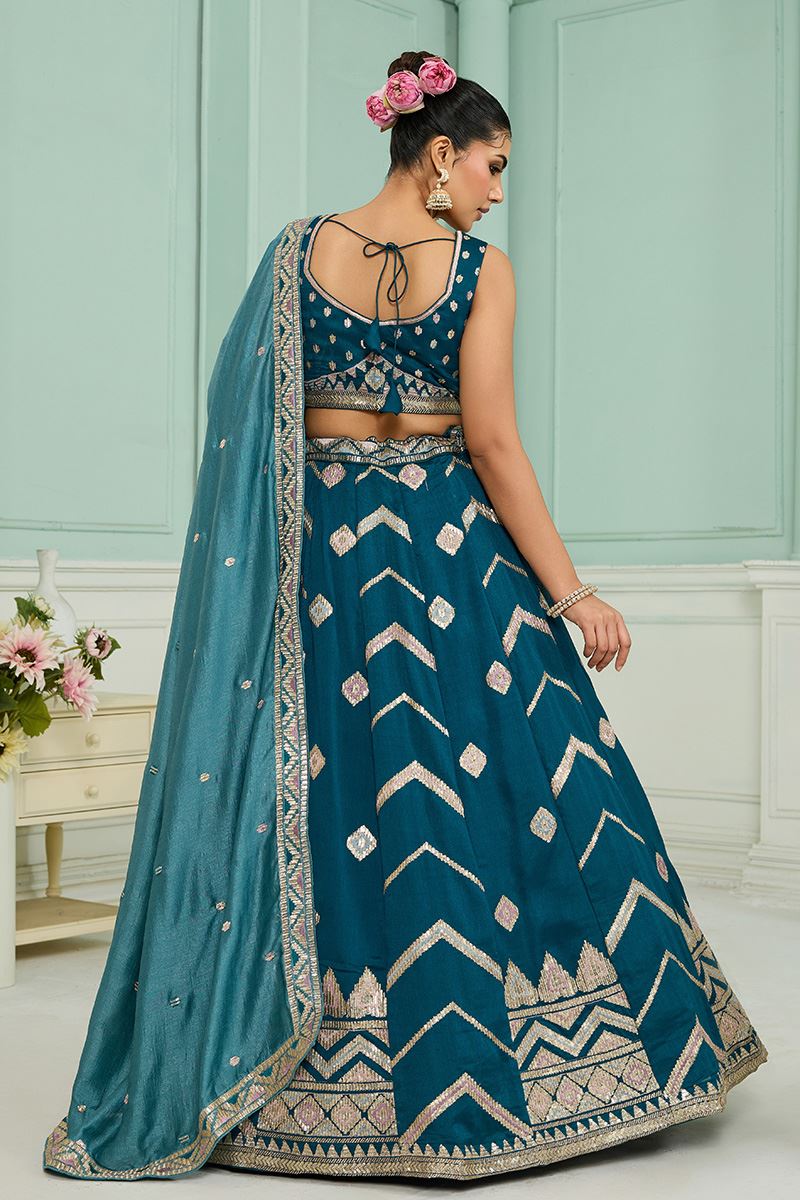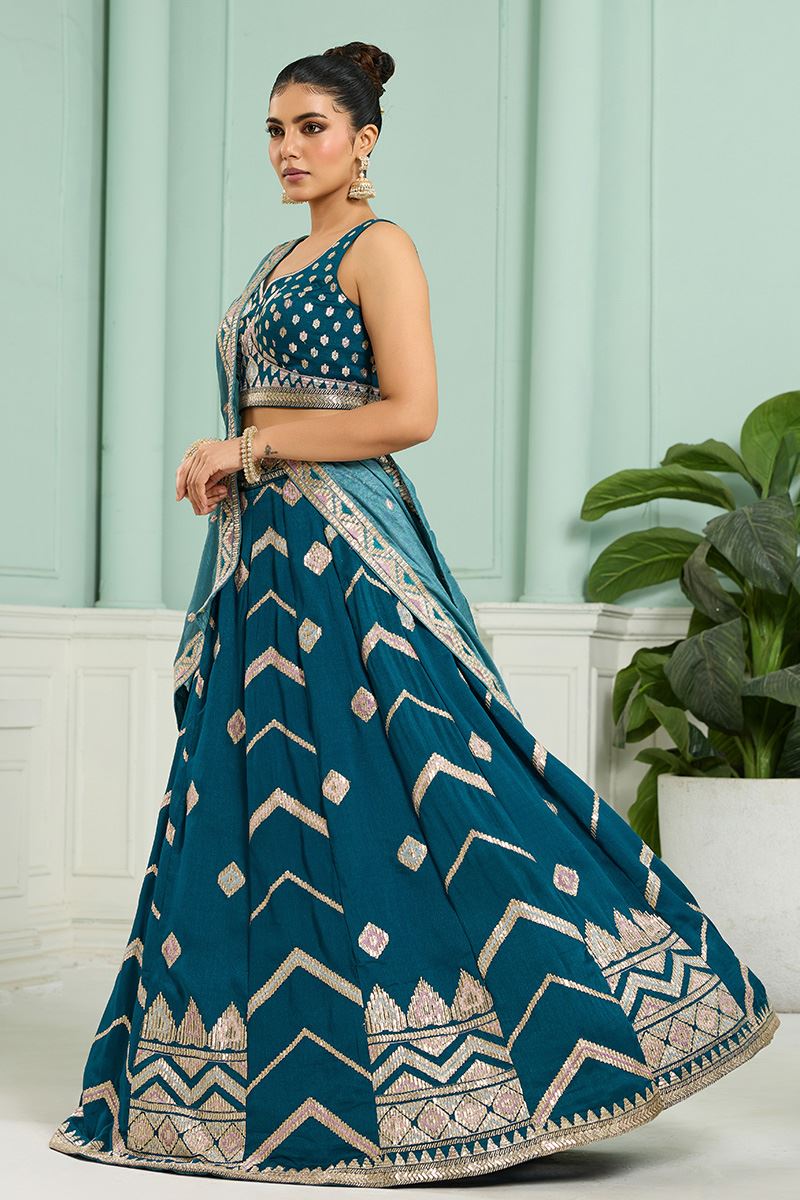 Get praised for your beauty and charm with this heavenlyTeal colored Designer Indo-Western Lehenga Choli. Buy this lehenga choli crafted from Silk fabric embellished with Beads, Stone, Coding and Embroidery Work. Has a Thread Cut Work Border on the Hemline. The lehenga has a double shantoon inner with a layer of can can 17 inches with 2 layers of Buckram 4 and 12 inches. The flare of the lehenga is 3.2 meters and the length is 42 inches. The waist and the bust of the lehenga and choli are customizable up to 40 and 42 inches. Complete your look with ethnic jewelry and heels. The ensemble includes a matching, Silk fabric dupatta embellished with sequin ethnic motif with an embroidery border work. The length of the dupatta is 2.5 meters and the width is 1 meter. Please note that color variations may occur due to digital photography, and the accessories shown are for illustrative purposes only.