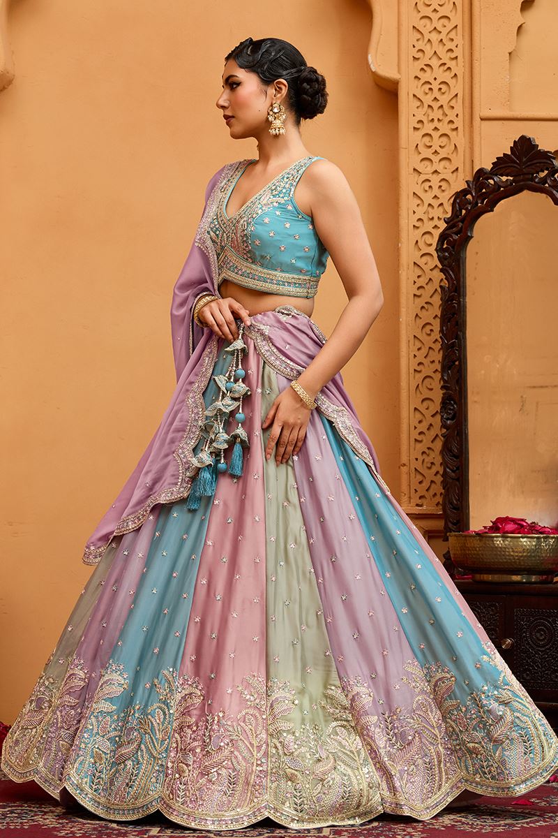 Lift up your style quotient with this divineMulti colored Designer Indo-Western Lehenga and Turquoise Blue colored Choli. Shop online for this lehenga choli crafted from Georgette fabric embellished with Sequin and Stone and Coding Work. Has a Thread Embroidery Work. Has a Thread Cut Work Border on the Hemline. The lehenga has a double shantoon inner with 2 layers of can can 12 and 18 inches with Buckram 4 and 12 inches. The latkan adds a charm to the lehenga composed of hand-made round-shaped tassel, with ethnic work hanging beads latkan. The flare of the lehenga is 4.0 meters and the length is 42 inches. The waist and the bust of the lehenga and choli are customizable up to 40 and 42 inches. Complete your look with ethnic jewelry and heels. The ensemble includes a Peach colored, Georgette fabric dupatta embellished with sequin ethnic motif with an embroidery border work. The length of the dupatta is 2.5 meters and the width is 1 meter. Please note that color variations may occur due to digital photography, and the accessories shown are for illustrative purposes only.