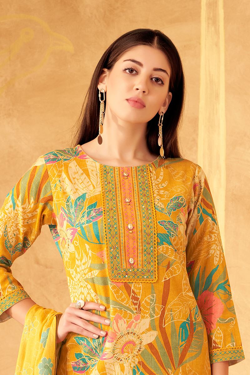 Feel comfortable without compromising on style by wearing this ravishing Mustard designer straight cut suit. Buy this suit crafted from Cotton Blend fabric, which features Digital Print and Embroidery Work. Enhance your ensemble with ethnic jewelry and a pair of heels for a sophisticated touch. The suit comes with a matching dupatta and pant both made from Cotton Blend fabric. Please be aware that slight color variations may occur due to digital photography, and the accessories shown are only for illustration.