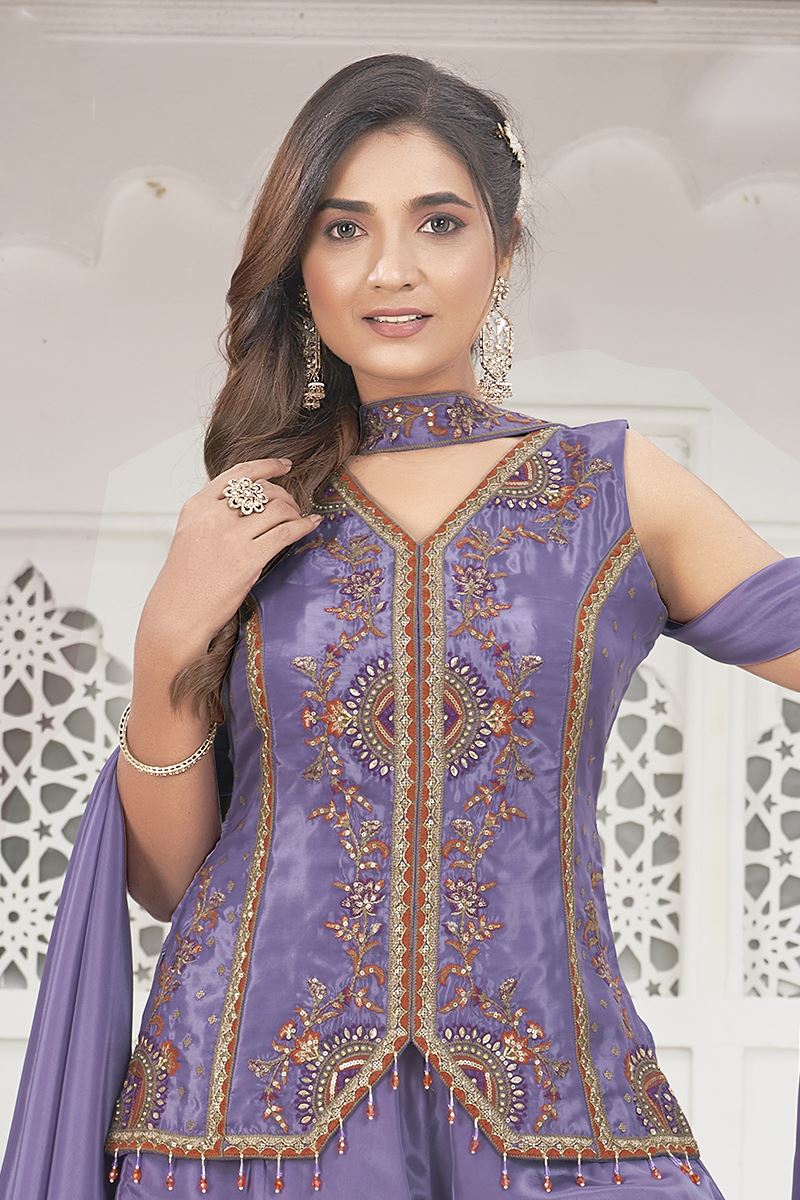 Get praised for your beauty and charm with this heavenly Lavender designer palazzo suit. Buy this suit crafted from Silk fabric, which features Sequin and Thread Embroidery Work. Enhance your ensemble with ethnic jewelry and a pair of heels for a sophisticated touch. The suit comes with a matching dupatta and a palazzo bottom made from Silk fabric. Please be aware that slight color variations may occur due to digital photography, and the accessories shown are only for illustration.