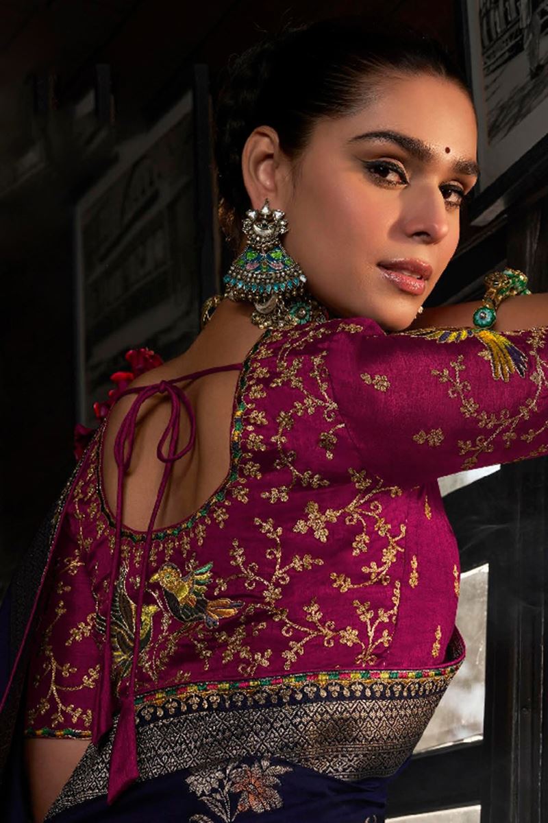 Get praised for your beauty and charm with this heavenly Navy Blue colored designer saree. Order this saree which is made of Soft Dola Viscose Silk fabric and is beautifully crafted with 3D Weaved Pallu & Fancy Lace Border with Heavy Embroidery and Zari Work. Pair this saree with ethnic jewellery and a pair of heels to elevate your style. This saree comes with a Magenta colored, Silk blouse fabric. Note slight color variation may be possible due to the digital photography. Accessories shown in the image is for photography purpose.